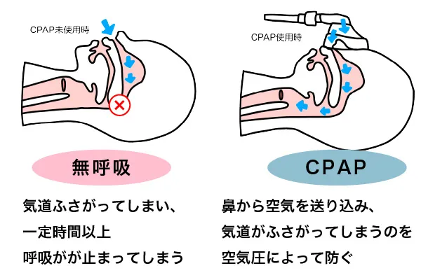CPAPはマスクを通じて⿐から気道へ空気を送り込むことで、上気道の閉塞を取り除き、睡眠中の気道を確保します。